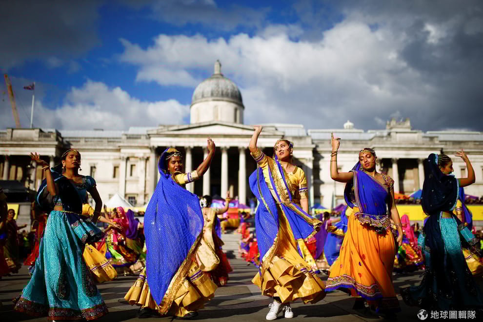 在倫敦特拉法加廣場(Trafalgar Square)上,一群舞者穿上華麗的服飾,用舞蹈慶祝印度排燈節(Diwali)的到來。