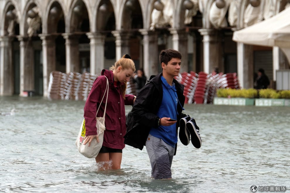 在威尼斯過去遊人如織的聖馬可廣場(Saint Mark Square)上,一對情侶提著鞋子涉水而過。29號時,威尼斯遭逢罕見暴雨,導致水位暴漲超過 150公分,整個威尼斯有四分之三淹水,成了名符其實的水都。