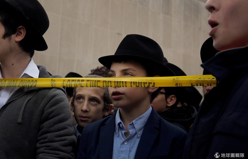 在賓州匹茲堡市的生命之樹猶太會堂(Tree of Life synagogue)外,一群猶太人在封鎖線外替槍案死者祈禱。
