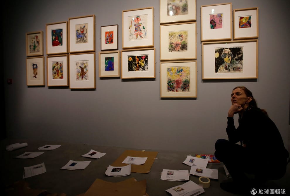 在普羅旺斯地區艾克斯市(Aix En Provence)的藝術中心,一名工作人員正在布置巴黎派畫家夏卡爾(Marc Chagall)的作品。