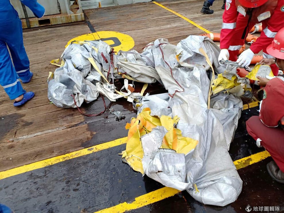 印尼石油公司的工作人員正在檢視他們打撈上船的機骸,他們認為甲板上的飛機殘骸正是 29號墜機的印尼獅子航空 610號班機。
