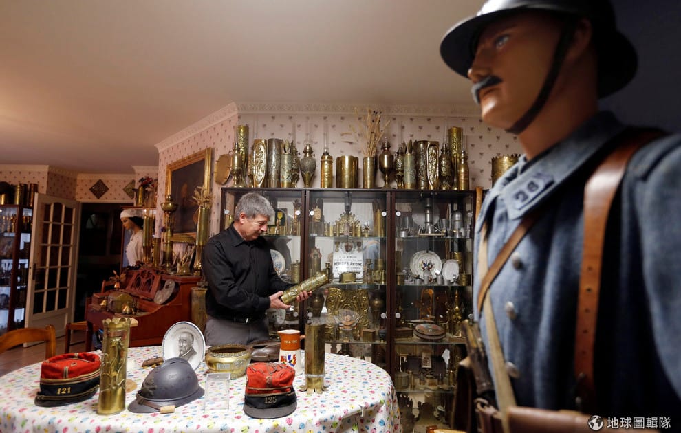 在西南部的巴爾馬(Balma)小鎮,法國收藏家朱帝切(Serge Giudice)手上拿著用第一次世界大戰時砲彈碎片雕刻而成的花瓶,他和妻子從 20多年前就開始收集有關一戰的紀念品,目前家中已經有超過 3,000件珍貴的一戰收藏品和文件。