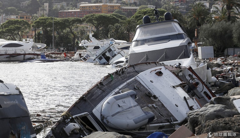 來到西北城市利古里亞(Liguria),這裡遭逢了每小時 150公里的強風襲擊,導致數十艘停泊船隻亂七八糟地撞成一團,有些船則在海面上載浮載沉,義大利《安莎通訊社》便形容整個景致就像「遊艇大屠殺」一般。