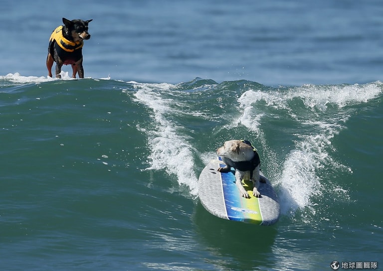 人有衝浪大賽,狗狗也有自己的衝浪比賽,照片中領先的狗狗趴在衝浪板上回頭瞄競爭對手。