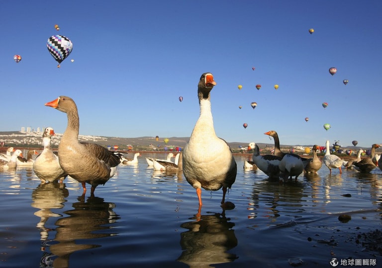 墨西哥正舉行熱氣球節,天上的色彩繽紛的熱氣球緩緩上升;而地面上的鴨群對熱汽球壓根沒興趣,在池塘裡玩水玩得正歡。