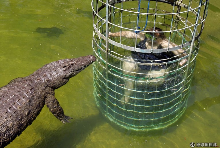 鱷魚好奇地游向籠子,觀察籠子中的遊客。這家野生動物園區提供堅固的籠子讓遊客可以待在裡面,和鱷魚近距離接觸。
