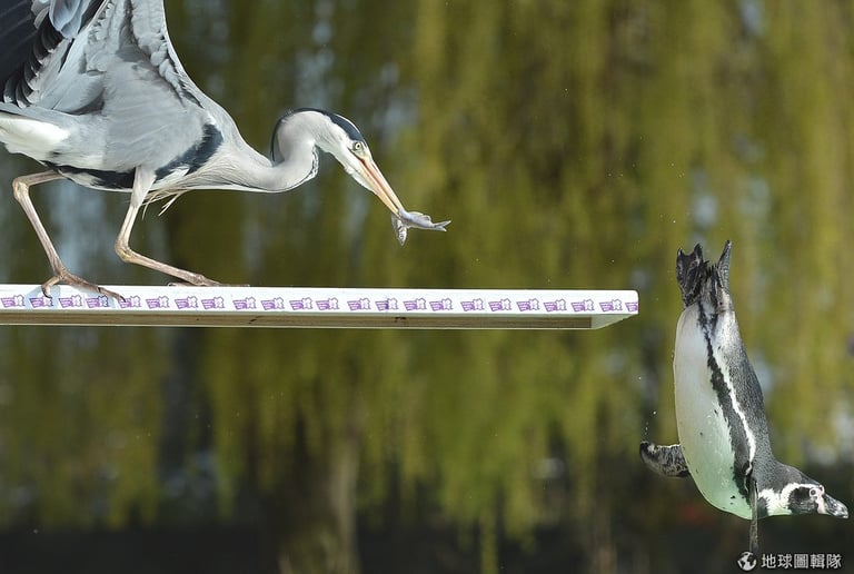 洪氏環企鵝興高采烈地跳進水中游泳,一百分的跳水姿勢讓旁邊的蒼鷺看傻了眼,忘記嘴裡還叼著一條鮮魚。