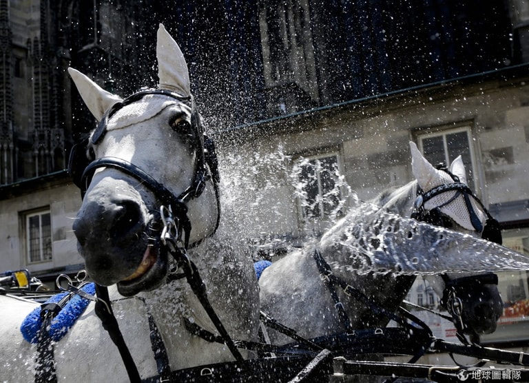 馬兒站在廣場上等著載客人,主人擔心馬受不了天氣的炎熱,用水柱噴向馬兒幫助他們降溫。