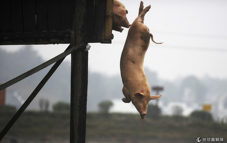 一隻隻的小豬排隊等著跳進河裡游泳,小豬的主人每天都會固定帶他們到河邊跳水運動身體。