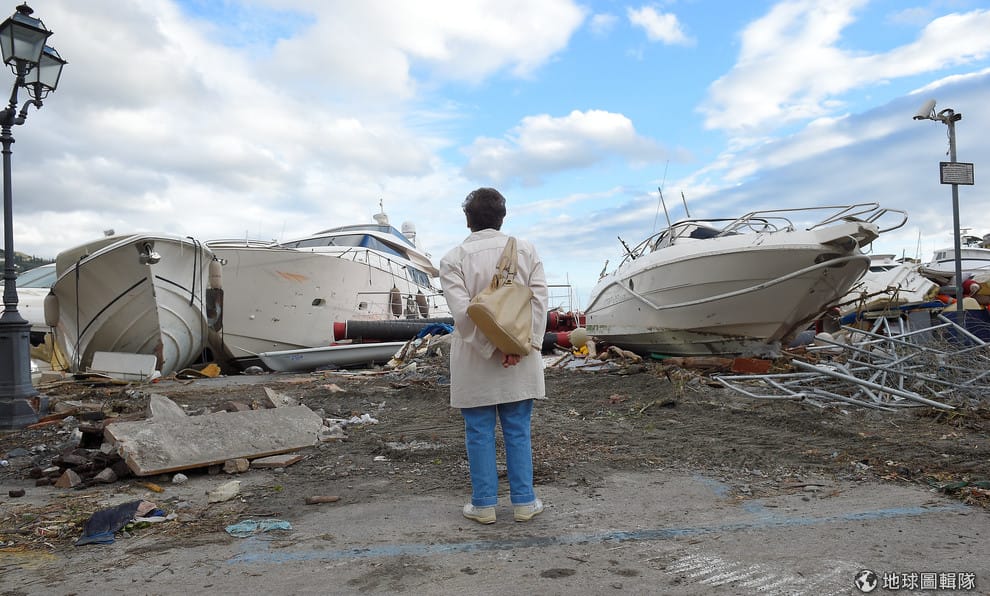 在義大利北部熱那亞省的拉帕洛小鎮(Rapallo),一名女子看著眼前被暴風雨吹得東倒西歪的遊艇。
