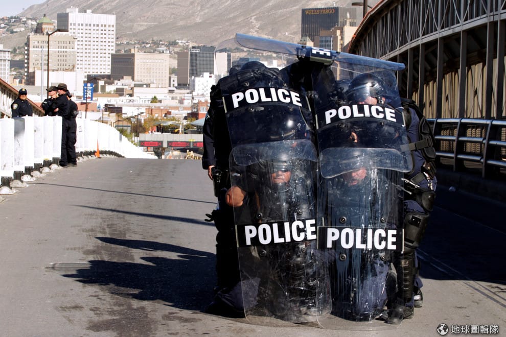 在位於華瑞茲城(Ciudad Juarez)連接美墨邊界的橋上,美國海關和邊境保護局人員全副武裝,參加防止非法移民偷渡進美國的演習。