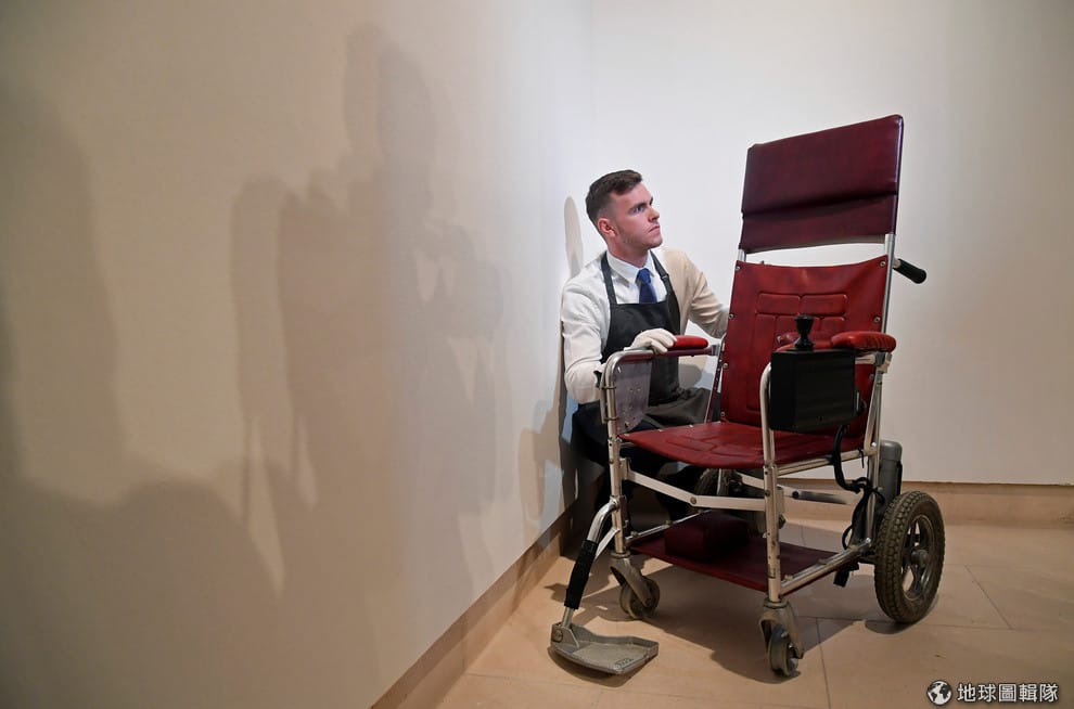 在倫敦佳士得(Christie's)拍賣行,一名工作人員正在整理已故英國物理學家霍金(Stephen Hawking)生前乘坐的輪椅,這台輪椅即將和其他霍金的私人物品一起開放競標。