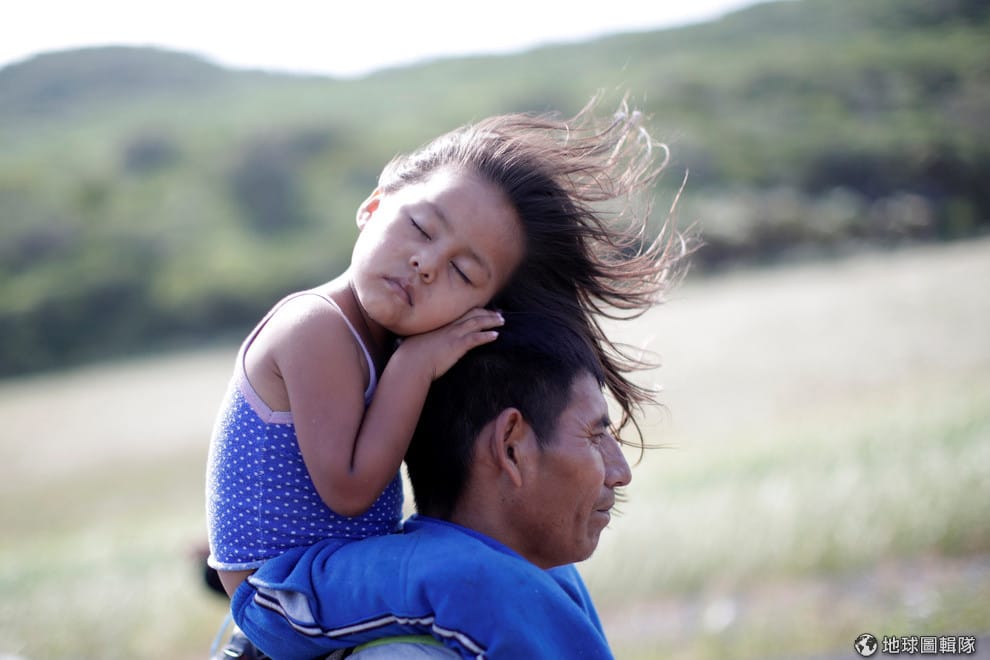 來自瓜地馬拉的伊莎貝(Belinda Izabel)趴在爸爸諾維加(Rosendo Noviega)的背上,跟著其他「車隊移民」(Migrant Caravan)一起走在墨西哥的高速公路上,打算一路往北抵達美國展開新生活。