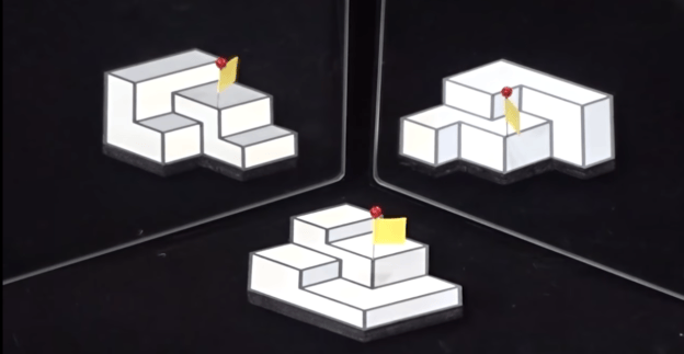 透過巧妙使用陰影及 2D 紙板,錯覺先是讓大腦誤認為紙板是 3D 的。而隨著觀察者從不同的角度觀察物體,視角發生變化,大腦便開始會以不同的方式解釋這些視覺線索,將物體的線條看起來傾斜,並使各種平台和突起交替產生視覺上的 3 種不同情況。