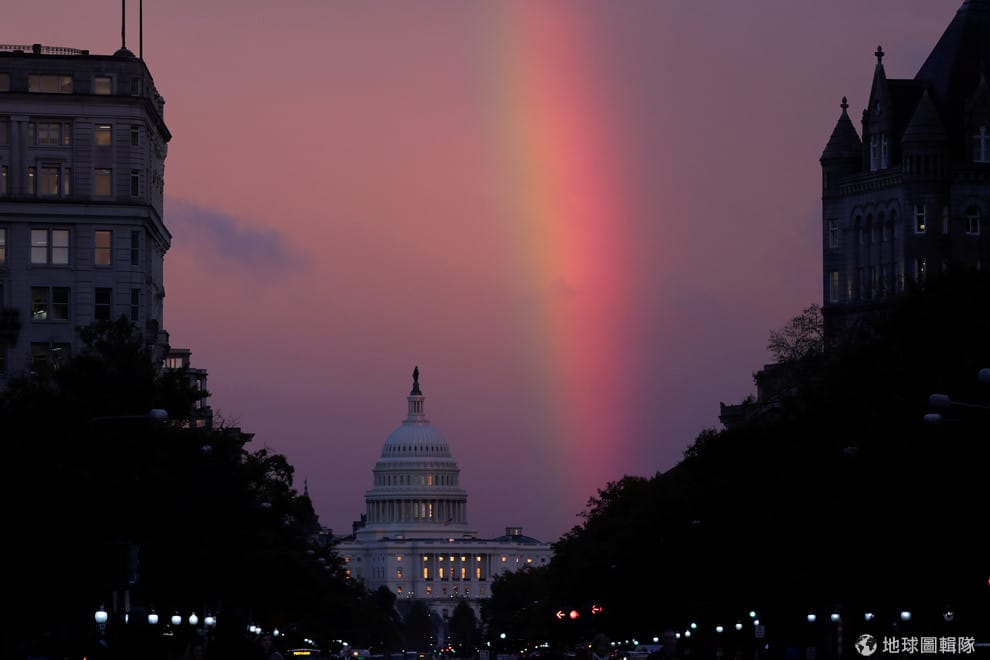 在美國期中選舉這一天,位於華盛頓特區的國會山莊上出現了一道彩虹。
