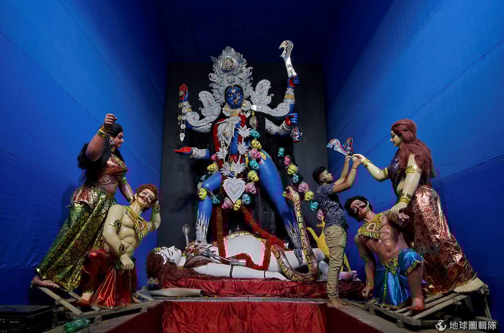 在加爾各答舉辦的迦梨女神節(Kali Puja festival)上,當地工匠忙著在最後一刻妝點迦梨女神像。迦梨女神被認為是掌管時間之神,象徵著新生,她通常被描繪成有四隻手臂的兇惡女性,脖子上會掛著一串人頭,腰間則繫著一圈人手,手上會拿著武器,而她的腳下常常踩著濕婆神。