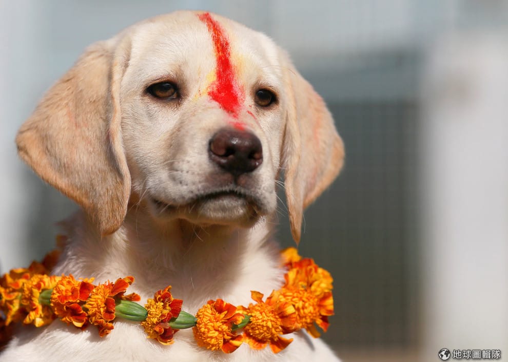 在首都加德滿都慶祝排燈節(Diwali)的場合上,一隻小狗戴上花環、塗上彩粉,和人類一起歡度這個重要的節日。