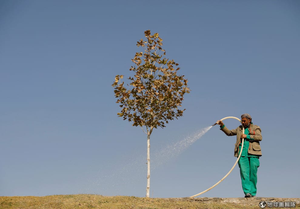 在首都喀布爾(Kabul),一名男子拿著水管澆著附近唯一的一棵樹。
