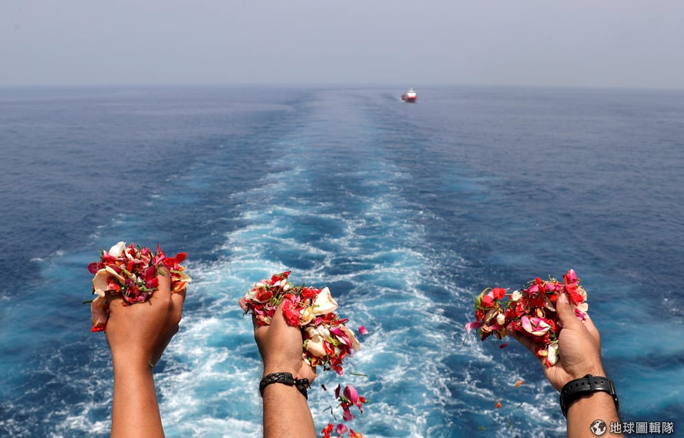 在印尼獅子航空 610號航班墜落的爪哇海域,罹難者家屬和同事將花瓣灑在大海上,悼念他們回不來的親友。