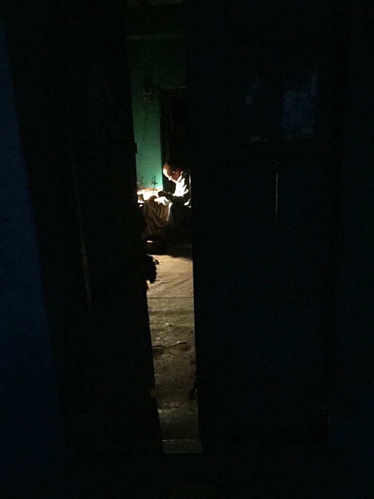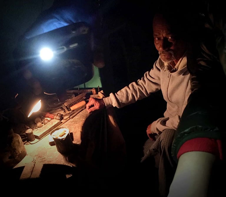 有了寶石再來就是製作戒指,蘇利室興奮地帶我們去見「卡修拉荷最傳奇的金工師傅」。沿著彎彎的小巷,蘇利室在一個破舊的木門前面停了下來,用力地敲了木門幾下,一個小男孩使力打開了木門。木門後,一片漆黑深處的亮點中,坐著卡修拉荷最傳奇的金工師傅。