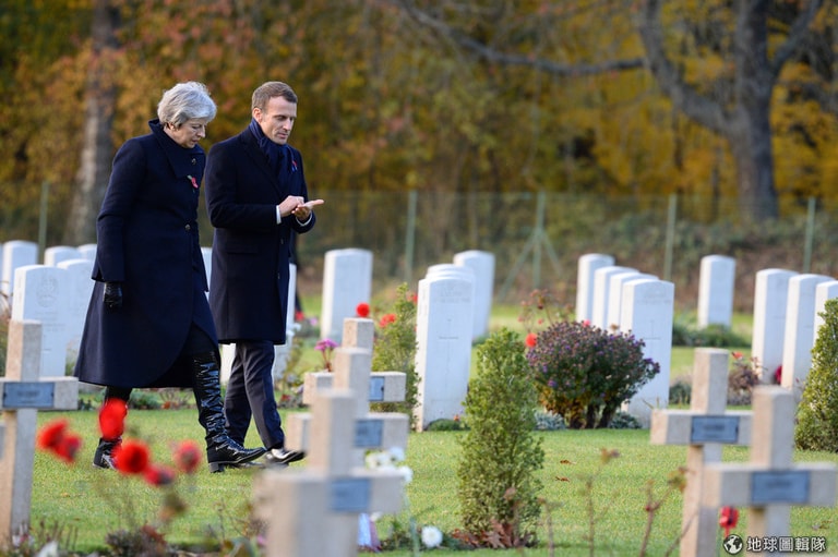 在法國北部的蒂耶普瓦勒紀念墓園(Thiepval Memorial),英國首相梅伊(Theresa May)和法國總統馬克宏(Emmanuel Macron)一起來向在「索姆河戰役」(Battle of Somme)中喪生的軍人致意。這場戰役是第一次世界大戰中規模最大的一次會戰,英法兩國合力想突破德軍的防線,然而最後作戰計畫失敗,英法聯軍和德國傷亡人數共 130萬人,是一戰中興生最慘烈的陣地戰。