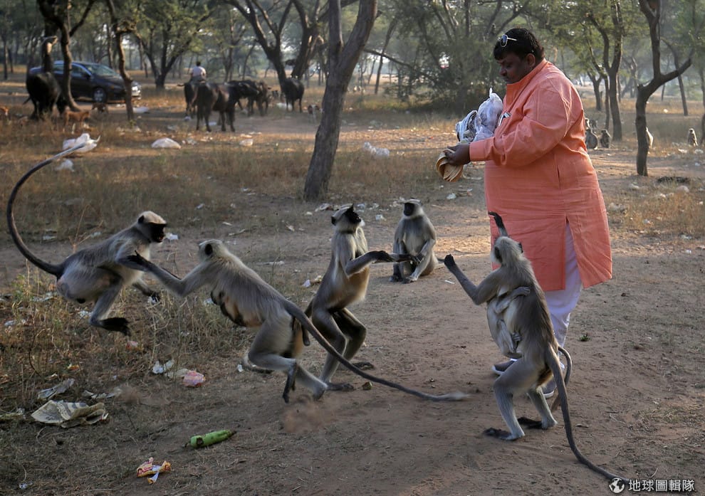 在艾哈邁達巴德(Ahmedabad)郊外,珠寶商娑尼(Swapnil Soni)正在用印度烤餅(chapati)餵食公園裡的葉猴(Langur)。娑尼餵食這些葉猴已經持續了 9年,據他所稱,他每個禮拜都要餵食 1,700個烤餅給超過 500隻葉猴,葉猴對他來說就像家人一般。