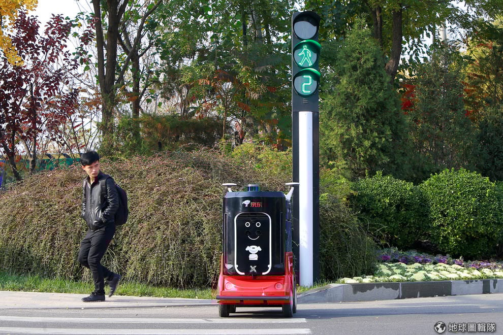 在天津的街道上,一名男子忍不住盯著正在過馬路的送貨機器人瞧。