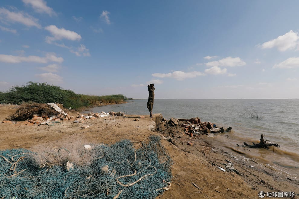 在巴基斯坦南部,一名男孩所站立的地方本來有座村落,卻因為海水侵襲的緣故逐漸荒廢了。
