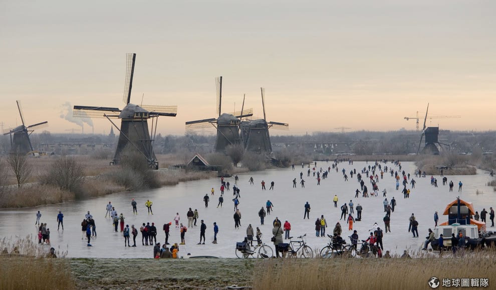 圖為 2009年1月在小孩堤防風車村,一群人聚集在結冰的運河上玩耍。