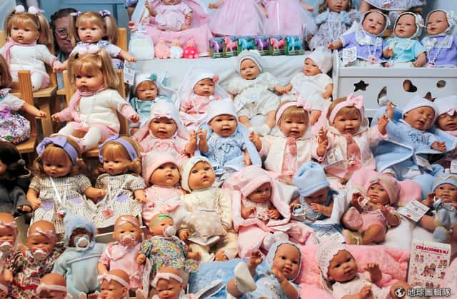 在西班牙國際純種馬展覽會(SICAB International Pre Horse Fair)上,成排的娃娃在展示架上等待買主。