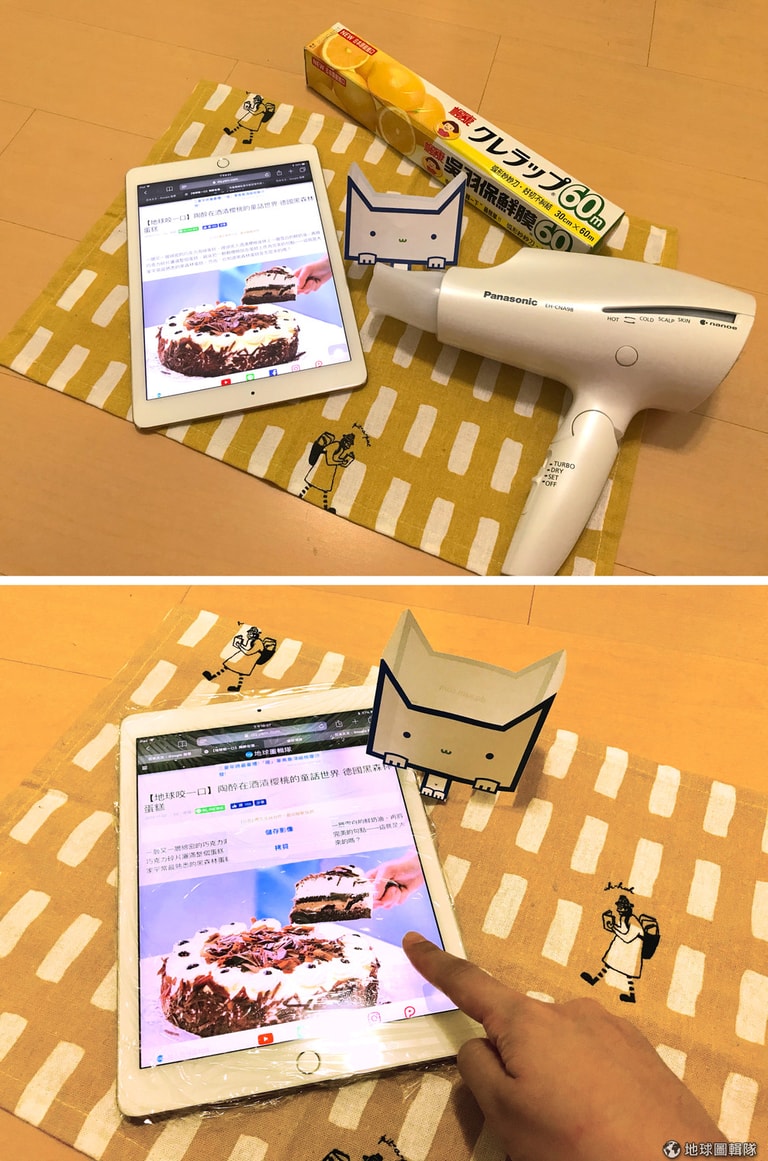 如果覺得保鮮膜不平整,也可以用吹風機的熱風吹個兩下,這樣保鮮膜就會相對服貼在手機上了。(某小隊長實證表示:像包膜一樣!但其他小隊長表示懷疑。)