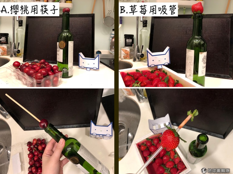 這時候只要把櫻桃放在大小合適的瓶口上,再拿根筷子從櫻桃中間快速戳下去,就大功告成啦!