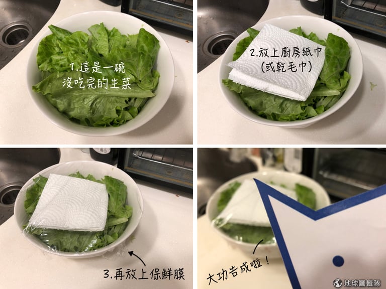 在你把容器封起來放入冰箱前,先在裡頭放一張廚房紙巾或乾毛巾來吸收濕氣,如此一來,就能讓生菜多放很多天囉!(如果你注意到紙巾/毛巾濕掉的話,也記得要更換一下)