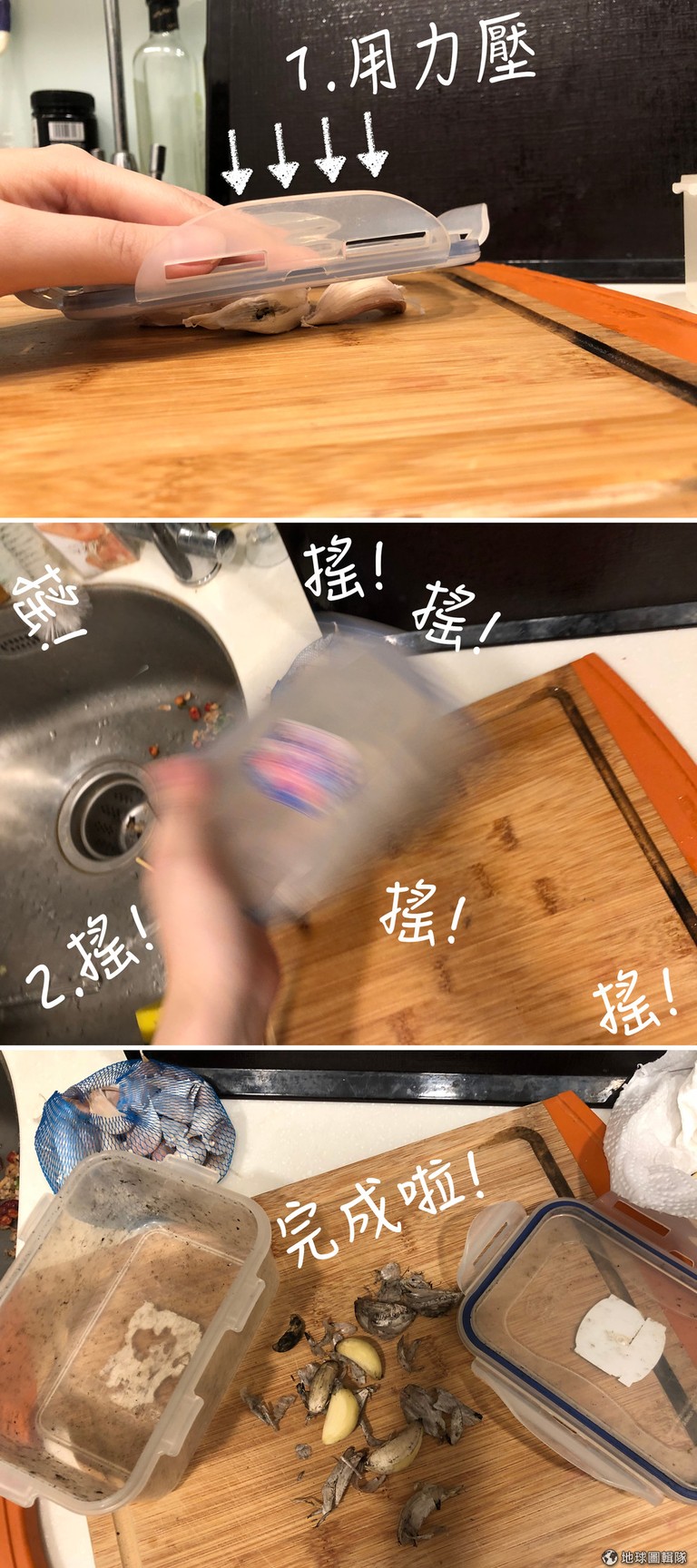 不過就像第三張圖呈現的那樣,在小隊長實測後,不知道是不是搖動的方式不對,其實有些蒜皮並沒有被搖開,只是搖過後確實有比較好剝啦!