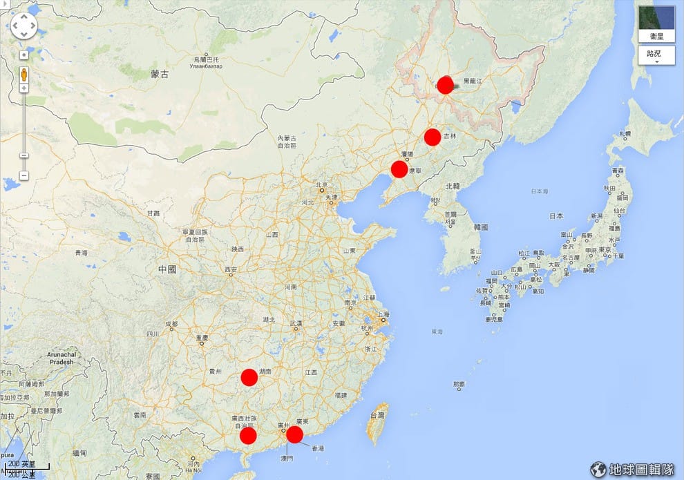 圖中的標記點就是近日深受水災重創地區。從上週開始,中國東北方的遼寧省、吉林省、以及黑龍江省受到暴雨和水患肆虐。南方的廣東、廣西壯族自治區、以及湖南省等地也因為颱風肆虐出現嚴重水患災情