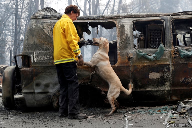 在坎普大火肆虐過後,一名消防人員帶著尋屍犬尋找遺體。