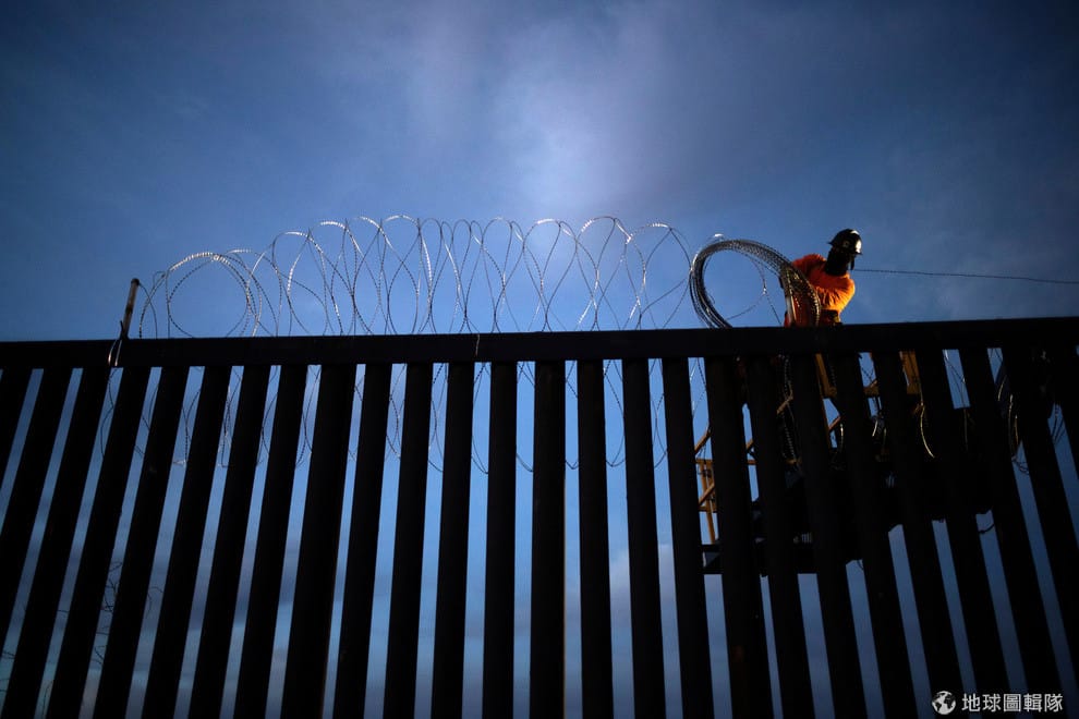 在美墨邊境的圍牆上,一名工人正忙著設置阻擋非法入境者的鐵絲網。