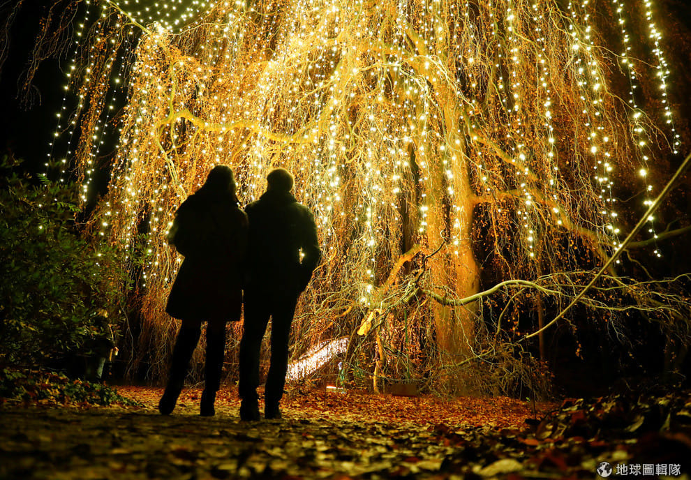 在位於柏林的植物園裡,遊客正在欣賞為了迎接聖誕節所架設的燈光造景。