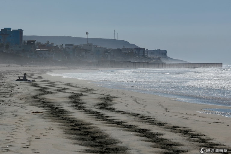 一對夫妻坐在沙灘上,畫面延伸過去是分隔出美國與墨西哥的邊境圍牆。