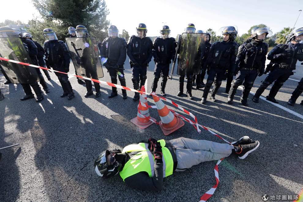 法國共和保安隊(CRS)就好警備位子,在他們跟前是一名躺在馬路上、身穿黃背心的示威男子,他和其他數百人以防堵街道的方式抗議,不滿法國政府決定要調高燃料稅。