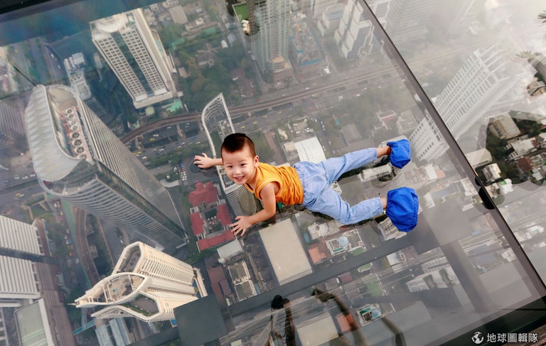 一名小男孩趴在玻璃天橋上接受拍照,這座在 2016年3月開始使用的天橋是泰國第一座玻璃天橋。