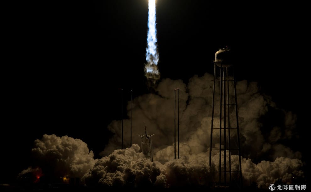 在NASA的瓦羅普斯飛行研究所,由諾斯洛普格拉曼公司(Northrop Grumman)所有的天蠍號火箭(Antares)正在升空。該火箭運載了配有 3,350公斤物資的太空船天鵝號,準備替待在國際太空站(ISS)的太空人提供補給品。