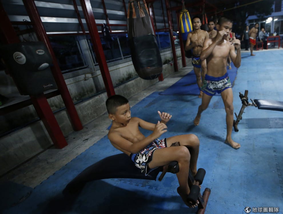 圖為 14號,在泰國曼谷的泰拳訓練營裡,小小泰拳選手薩恩根和其他泰拳選手們各自展開練習。