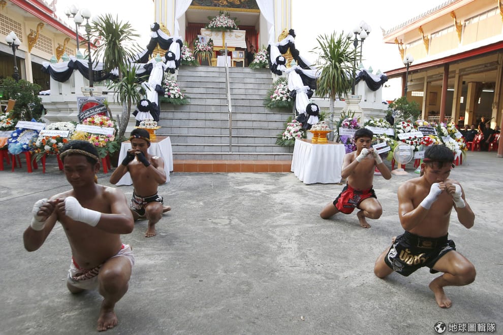 圖為本月 15號,在塔撒可的喪禮上,泰拳選手們跳著傳統舞蹈向死去的塔撒可致敬。