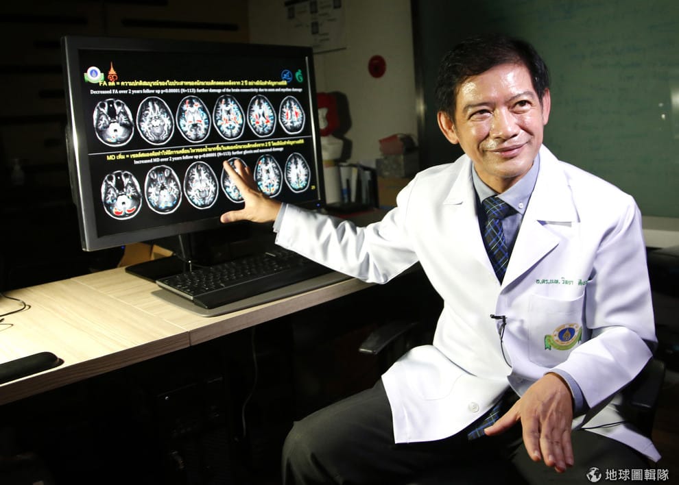 圖為 14號,醫生蘇卡拉特指著螢幕上的大腦斷層圖,向記者解說打泰拳對於兒童大腦發育造成的影響。