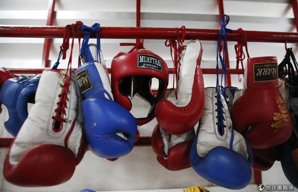 圖為 14號,在泰國曼谷一間泰拳訓練營裡,掛著一整排的泰拳護具。蘇卡拉特呼籲,15歲以下的泰拳選手應該要保護頭部,避免遭到直接攻擊。