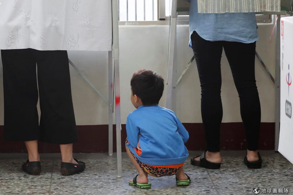 在高雄的投票所外,一名小男孩正在等他媽媽投完票。
