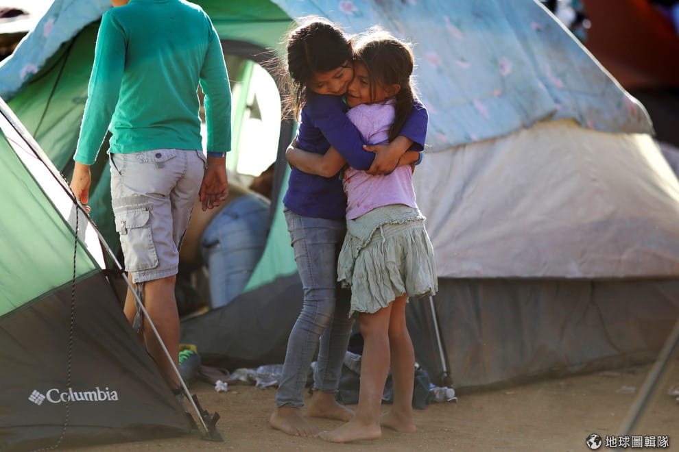 在美墨邊境城市提華納(Tijuana),今年 7歲的薩爾瓦多小女孩凡妮莎(Vanessa)和西蒂(Seydi)互相擁抱,她們是中美洲「車隊移民」(Migrant Caravan)的一員,希望可以順利入境美國開啟新生活。