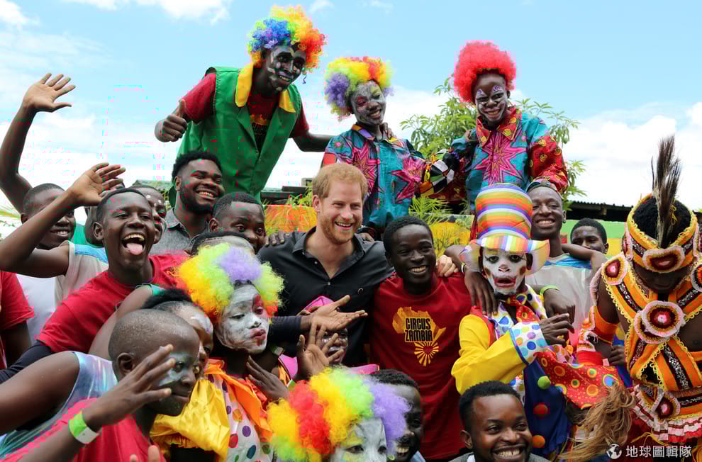 在首都路沙卡(Lusaka),尚比亞馬戲團的成員開心迎接到訪的英國哈利王子(Prince Harry)。