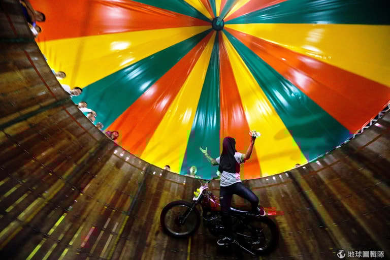 在曼谷一處名為「死亡之井」的表演場地上,一名特技人員掀起衣服遮住臉來騎機車。